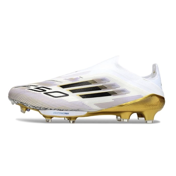 The adidas F50+ Elite Laceless FG arrives as part of the 'Road to Glory Pack'—White, Black and Gold accents. Built with Fibertouch upper, laceless design and Sprintframe 360 soleplate, it delivers explosive speed for the biggest stage.
