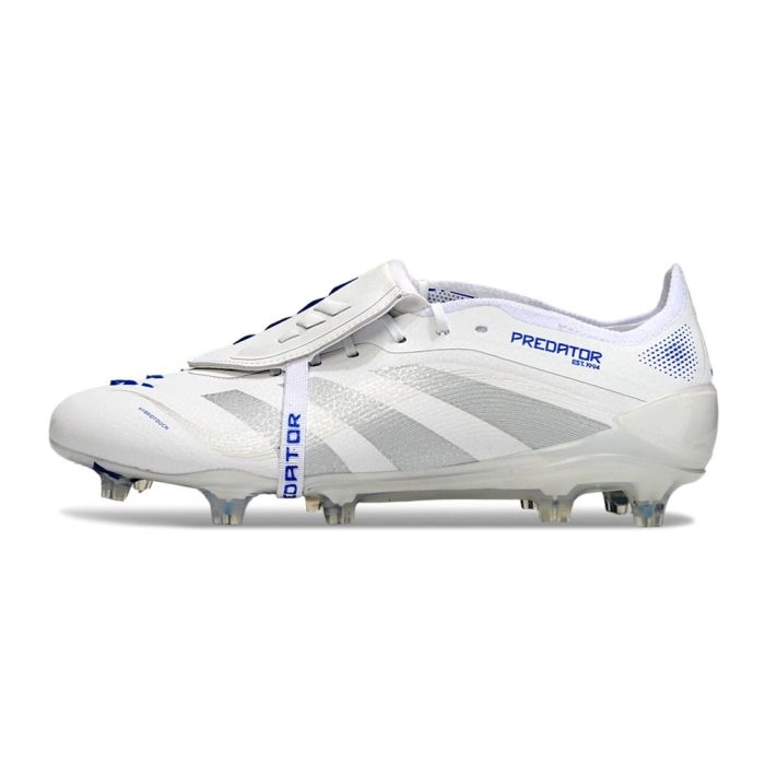 The adidas Predator Elite Fold-Over Tongue FG arrives as part of the 'Polar Victory Pack'—pristine White, shimmering Silver Metallic and bold Bright Royal accents. Built with HybridTouch 2.0 upper and refined Strikeskin fins, it delivers ruthless finishing power when every strike counts.
