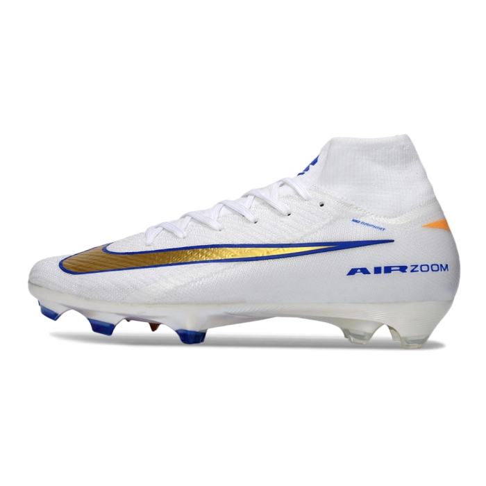 Nike Air Zoom Mercurial Superfly 10 Elite FG White Blue Metallic Gold in this high-energy palette is designed for the player who demands to be seen. This 10th-generation masterpiece introduces a premium-knit construction for ultimate comfort. Equipped with Gripknit and an improved Air Zoom unit, it is engineered for clinical precision and explosive speed on firm, natural grass.